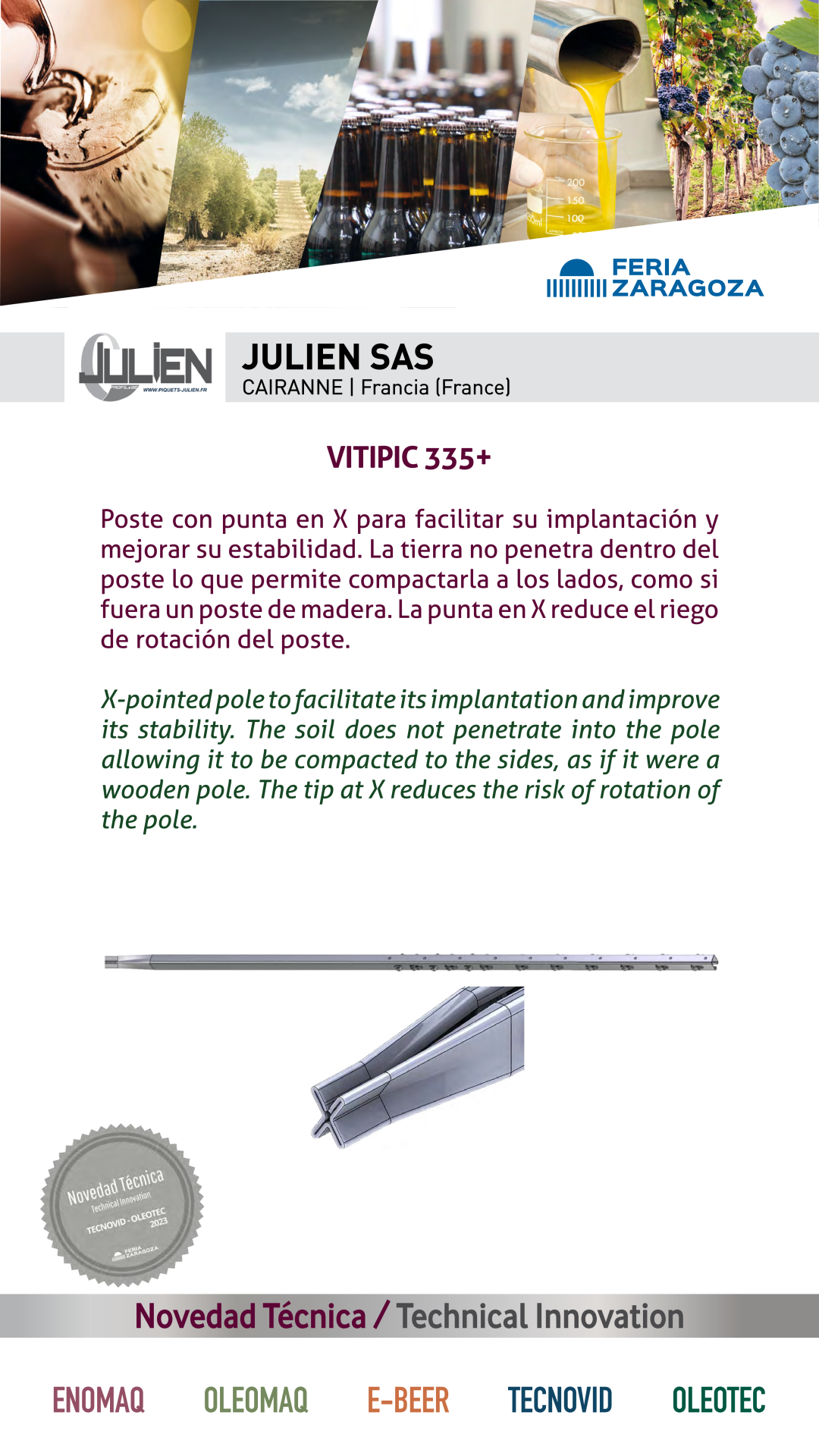 |  JULIEN SAS |  FRANCIA | VITIPIC 335+X-pointed pole to facilitate its implantation and improve its stability. The soil does not penetrate into the pole allowing it to be compacted to the sides, as if it were a wooden pole. The tip at X reduces the risk of rotation of the pole. |