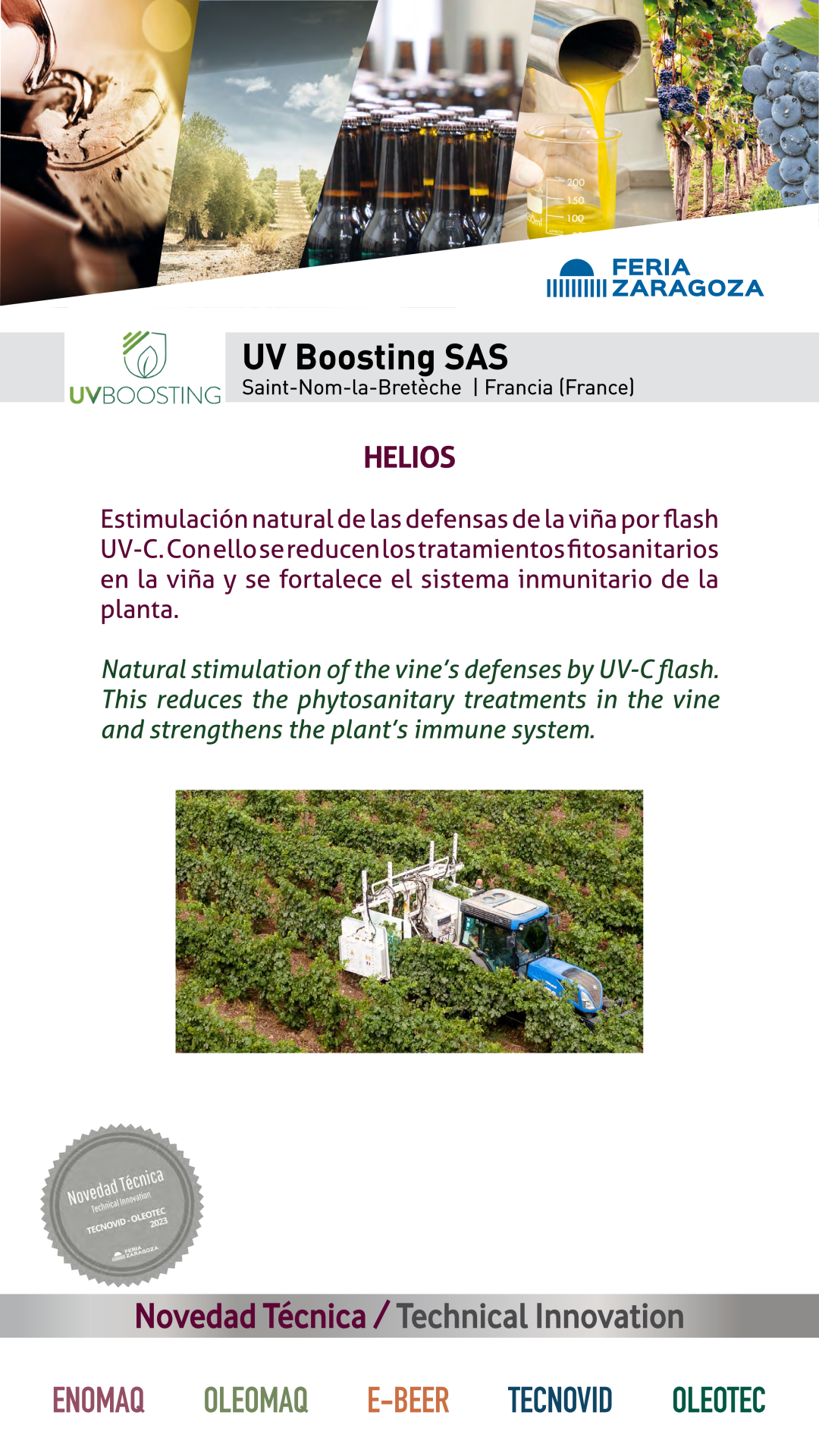 |  UV BOOSTING SAS |  FRANCIA | HELIOSNatural stimulation of the vine's defenses by UV-C flash. This reduces the phytosanitary treatments in the vine and strengthens the plant's immune system. |