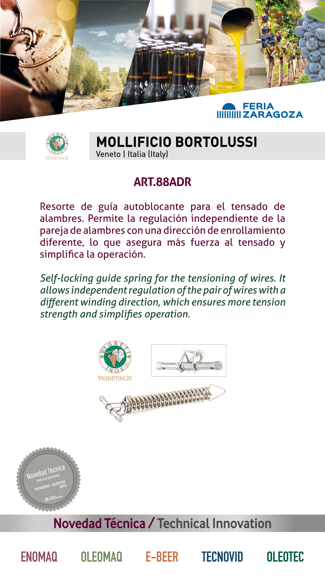 | Premio | Business | Procedencia | Product |  |  VIGNETINOX |  ITALIA | ART.88ADRSelf-locking guide spring for the tensioning of wires. It allows independent regulation of the pair of wires with a different winding direction, which ensures more tension strength and simplifies operation. |